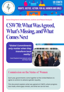 These realities sit within a broader global framework. The CSW70 Agreed Conclusions, adopted at the very start of the session, set the direction for advancing the rights of girls and women. As outlined in GSIJP’s analysis, CSW70: What Was Agreed, What’s Missing, and What Comes Next, the outcome reflects important commitments, but also clear gaps and limitations.