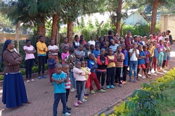 Caption Two: Sr. Justicia Nekesa stands with a group of children from the Euphrasia Vocational Training Institute’s mentorship program. Every Saturday, children from the Gichagi informal settlements visit and spend the day participating in dancing, art, singing, theater, beadwork, crocheting, environmental activities, cooking and first aid courses. (Courtesy of Justicia Nekesa)